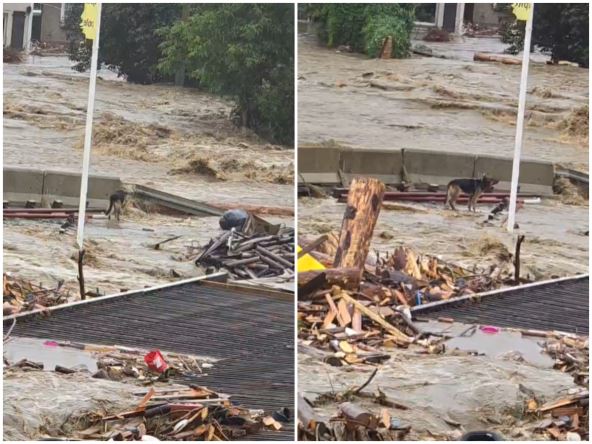 Pas je pokušavao da se popne na betonski blok. Sledeći put kada se kamera vratila tamo gde je pas bio, on više nije bio tamo. Voda ga je odnela zajedno sa jednim od blokova.