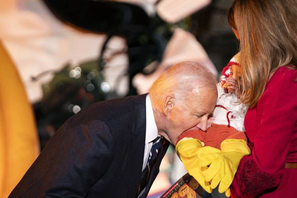 Tokom proslave, pretvarao se da grize mališane, uključujući jednog dečaka koji je nosio kostim pileta. Dečak se nasmejao kada je Bajden omirisao njegovu nogu.