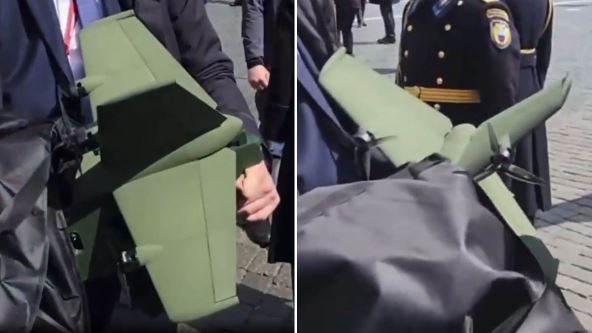 Na snimku koji se pojavio na internetu vidi se kako jedan od najbližih pripadnika Putinovog obezbeđenja nosi veliki ranac iz kog viri FPV dron neuobičajenog dizajna. Iako je pokušao da ga prikrije, deo trupa drona - verovatno karbonski ili kompozitni - bio je jasno vidljiv, pa su posmatrači uspeli da identifikuju ključne karakteristike.