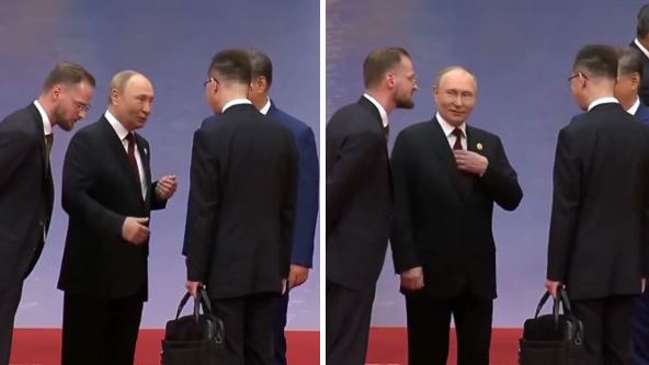 Putin se nalazi u centru pažnje i sve vreme ima gestikulaciju rukama dok govori. U jednom trenutku se čak uhvatio za kravatu da je popravi, dok kineski predsednik sve pažljivo sluša i smeška se, kao i njegova supruga Peng Lijan koja je stojala tik uz njega.