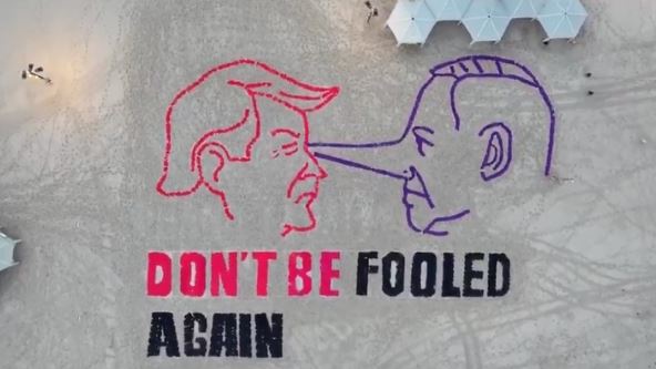 Na instalaciji je prikazano kako se Tramp i Netanjahu gledaju oči u oči, a Trampu je upućena poruka na kojoj piše: "Nemojte se više dati prevariti“.