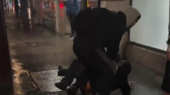 Osumnjičeni, obučen u crnu jaknu s kapuljačom, snimljen je kako pokušava da se oslobodi dok ga policajci obuzdavaju.