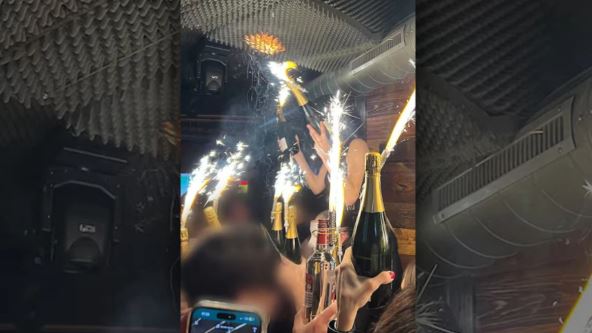 Snimci na kojima se vidi obišli su ceo svet - konobarica sa kacigom iz bara "Le Constellation" u Kran-Montani u kobnoj novogodišnjoj noći nosila je boce šampanjca ukrašene zapaljenim prskalicama, dok je sedela na ramenima maskirane osobe.