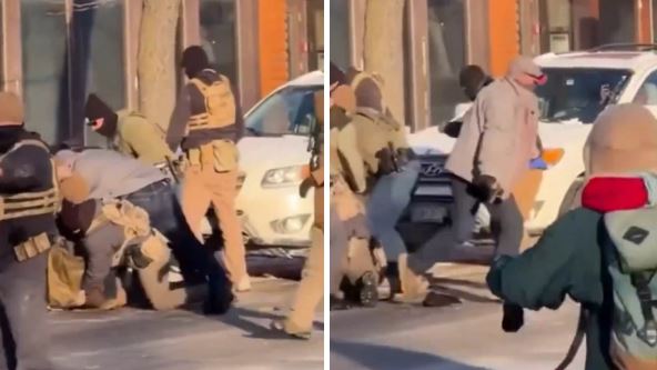 Agent mu zatim raspršuje sprej u oči. Preti okreće glavu i podiže jednu otvorenu ruku u vazduh. U drugoj ruci, čini se, drži mobilni telefon.