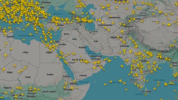 Mapa FlightRadar24 objavljena u nedelju pokazala je da je glavni vazdušni koridor istok-zapad iznad Iraka - inače jedna od najprometnijih vazdušnih "supermagistrala" koja povezuje Aziju i Evropu - bio gotovo potpuno prazan, što ističe razmere poremećaja.