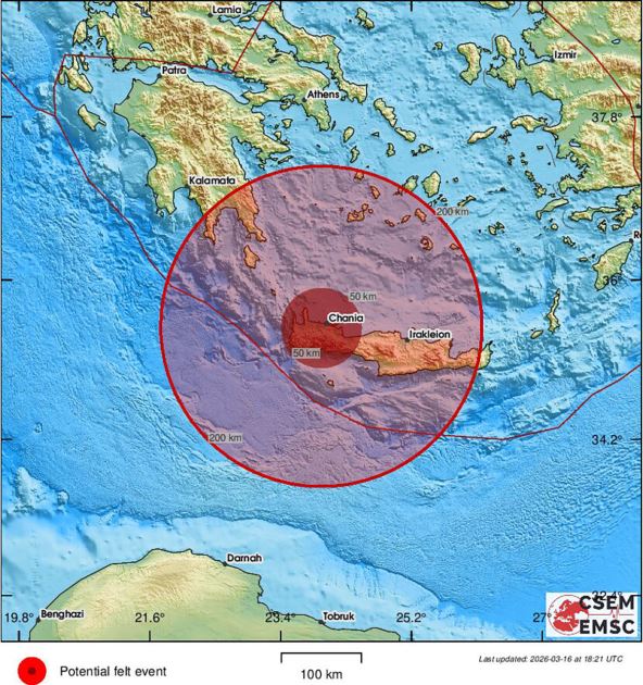 Snažan zemljotres magnitude 4,2 stepena po Rihterovoj skali pogodio je večeras ostrvo Krit u Grčkoj, javlja "EMSC", evropsko-mediteranski seizmološki centar. Epicentar je lociran na području sa geografskim koordinatama širine 35.1135 i dužine 23.8647 blizu južne strane poznatog ostrva.