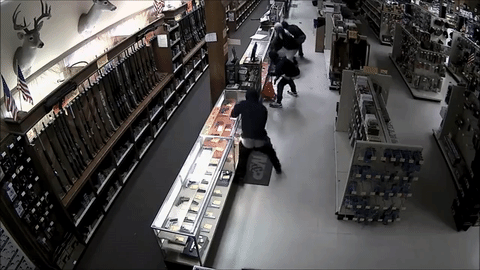 Za samo dva minuta, desetorica osumnjičenih razbojnika sa kapuljačama uspela su da razvale ulaz u prodavnicu oružja, uz pomoć pik-ap vozila na koje je bio privezan lanac.