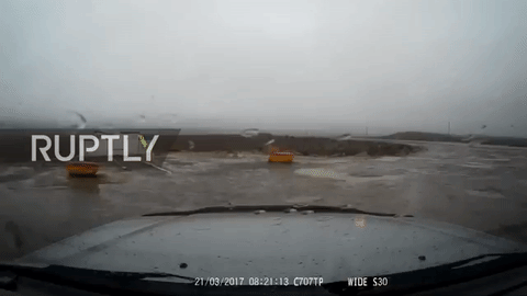 Na snimku zabeleženom kamerom na automobilu vidi se kako se automobil zaustavlja ispred toaleta pored puta, a u istom trenutku trošni javni WC se ruši.