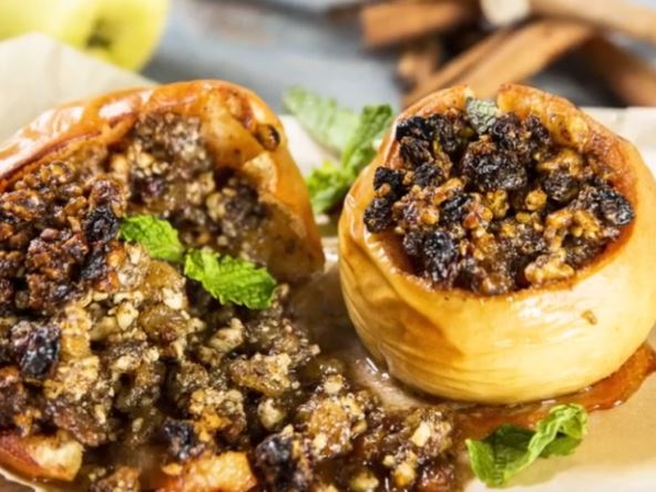 Dunje prepoloviti i izdubiti. Pomešati mlevene orahe, kandirano voće (ako je potrebno, još ga iseckati), sitno isečene lešnike, cimet, šećer i med, pa time napuniti dunje.