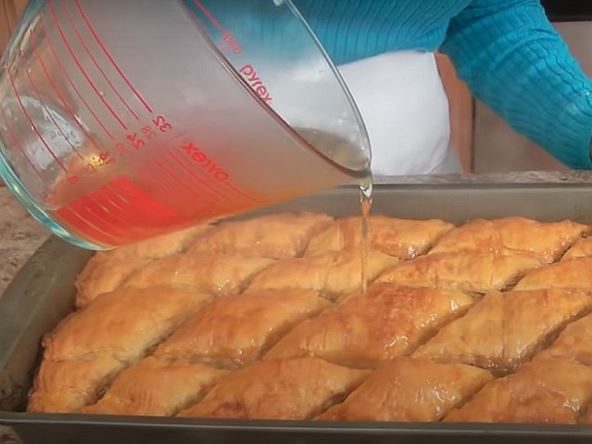 Sirup: Šećer pomešati sa vanilin šećerom, dodati sok od limuna i oko 150 ml vode, pa kuvati na tihoj vatri dok se sav šećer ne istopi. Vrelim sirupom preliti ohlađenu baklavu, posuti je sa malo cimeta i ostaviti je da upije šećerni sirup. Seći na kocke ili trouglove.
