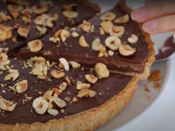 U brašno dodati šećer, žumance, so, na kockice isečen puter, kakao i mlevene lešnike. Brzo zamesiti glatko testo, oblikovati loptu, umotati u prozirnu foliju i staviti u frižider na najmanje 40 minuta. Na pari otopiti obe vrste čokolade sa slatkom pavlakom. Skloniti s pare i čokoladnu smesu prohladiti. Kalup za tart (prečnika 20 cm) nauljiti i posuti brašnom. Testo razvaljati na debljinu od oko 4 mm, obložiti kalup, a dno testa izbockati. Peći u prethodno zagrejanoj rerni na 180 stepeni C, oko 20 minuta. Pečeno testo malo prohladiti, pa na njega izliti čokoladnu smesu i posuti lešnicima. Staviti da se hladi najmanje 3 h pre služenja.