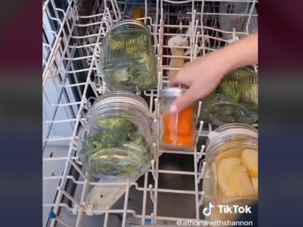 Brokoli, boraniju i šargarepu je stavila u tegle koje je napunila vodom, poređala ih u mašinu za pranje sudova i uključila standardni program.
