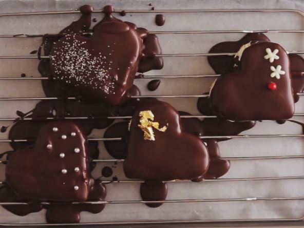 Gotov kolač iseći kalupima u obliku srca, pa svaki komad glazirati otopljenom posnom čokoladom.
