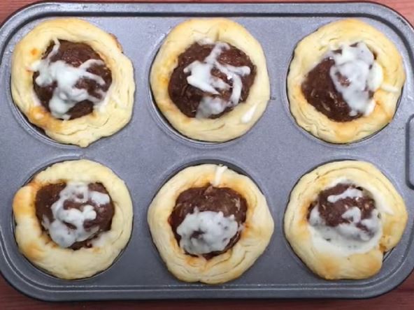 Kada su ćufte dobile braonkastu boju, po jednu stavljajte na svaki krug testa koji ste pripremili, a zatim to ubacite u papirne korpice, u pripremljen pleh za mafine, pa premažite mešavinom pavlake i žumanceta.
