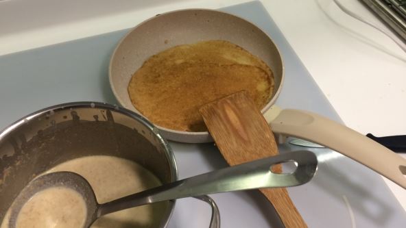 A ako pečete u običnom tiganju testo sipajte u vrelo ulje, pa kada je pečeno sa jedne strane, nožem odvojte sa strane i prevrnite je, pa dopecite sa druge strane.