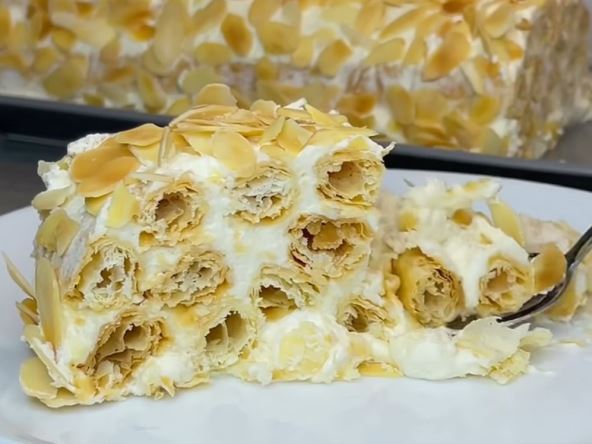 Lisnato testo rastanjite oklagijom, a zatim ga isecite na trake širine oko centimetar i po. Poređajte ih na pleh ostavljajući mali razmak između, a zatim ih pecite oko deset minuta na 200 stepeni. Izvadite ih i ostavite da se prohlade, a u međuvremenu napravite fil.