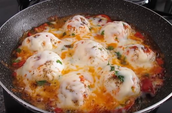 Jaja staviti da se bare. U međuvremenu iseckati paradajz na kolutove, a papriku na kockice. U tiganju zagrejati ulje i puter, pa dodati paprike. Pržiti dok ne omekšaju. Preko rasporediti kolutove paradajza. Barena jaja očistiti, pa iseći na pola. Polovine rasporediti po tiganju, preko paradajza, sečenom stranom nadole. Preko začiniti solju, biberom i mlevenom paprikom. Dodati iseckan peršun i ostaviti da se još prži. Posuti narendanim sirom i poklopiti. Ostaviti da se prži još kratko, koliko da se sir istopi.