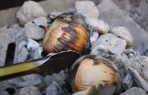 Ako ste već raspalili roštilj, uklonite rešetku i cele glavice luka (neoljuštene) stavite direktno na ugalj. Pecite ih tako 15-ak minuta uz okretamnje dok površina gotovo ne pocrni, a onda ih potpuno prekrijte ugljom i ostavite tako još 10 minuta. Potrebno je da se sačeka trenutak kada će sok početi da "curi" iz povrća.