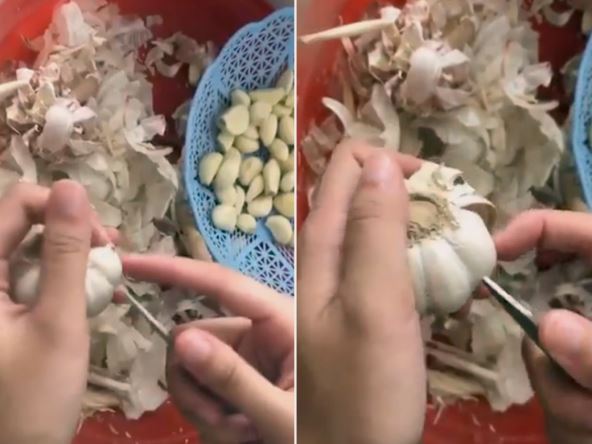 Evo i kako se to radi: u jednu ruku stavite glavicu luka, a u drugu mali nož kojim ćete nabosti čen i izvaditi ga jednim potezom iz ljuske. Pogledajte u praksi kako to izgleda...