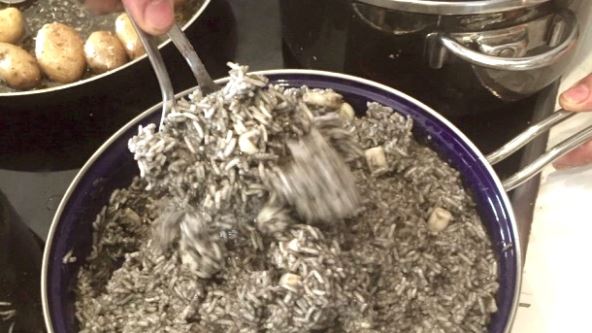 Propržiti na ulju sipe iseckane na krupnije komade, zajedno sa iseckanim crnim i belim lukom. Kad porumene, dodati pirinač i vino. Nakon desetak minuta dodati kockicu supe, a kada se skroz rastopi, i mastilo. Nekoliko minuta kuvati poklopljeno, a zatim skloniti poklopac i kuvati dok sipa i pirinač ne omekšaju, ali ne skroz.