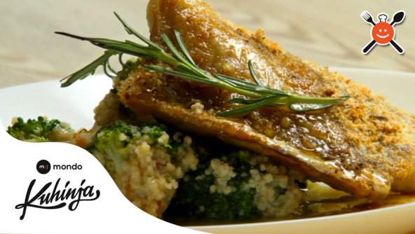 Poslužiti na plitkom tanjiru povrće sa kus kusom i parčetom hrskavog oslića.