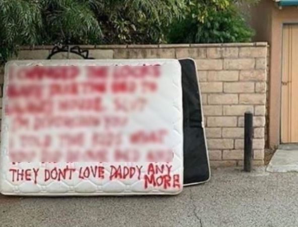 "Promenila sam bravu. Spavaj u njenoj kući. Razvodim se od tebe, rekla sam deci šta si uradio u našem krevetu i više te ne vole", piše jarkocrvenom bojom.