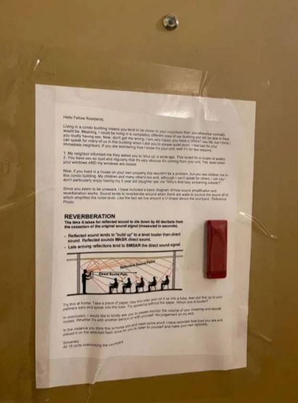 "Život u stanu znači da ste nešto bliže svojim komšijama nego što bi to bili u kući. To znači da bih ja mogao da živom u sasvim drugom delu zgrade i svejedno bih mogao da vas čujem koliko ste glasni u seksu. Nemojte da me pogrešno shvatite, ja sam jako srećan što imate odličan seksualni život, ali mislim da govorim u ime svih u zgradi kada vas molim da se malo stišate. Grozno mi je kada pomislim kako je vašim najbližim komšijama. Ne mogu reći da posebno uživam kada me moja petogodišnja ćerka pita 'zašto ona gospođa vrišti napolju'. Da zaključim, lepo vas molim da pripazite koliko ste glasni tokom seksa. Bilo da to radite zajedno ili sami, ja nemam predrasuda u vezi sa tim. U slučaju da mislite da su ovo sve gluposti i potreban vam neki dokaz, snimio sam koliko ste glasni i priložio USB uz poruku kako bi mogli da poslušate i sami zaključiti da li sam u pravu", pisalo je u poruci koja je potpisana s "18 stanova koji gledaju na dvorište".