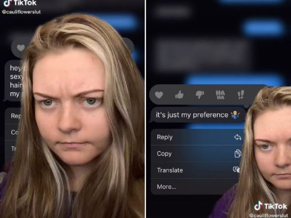 "Hej, ovo neće uspeti. Ti si seksi i zabavna, ali kada sam video tvoje neobrijane pazuhe, ja to ne mogu, jednostavno više volim obrijane pazuhe", poslao joj je on poruku, na koju je ona odgovorila: "Znači, u redu je da ti imaš dlakavi pazuh, ali ne i ja, žena, kojoj takođe tu rastu dlake?".