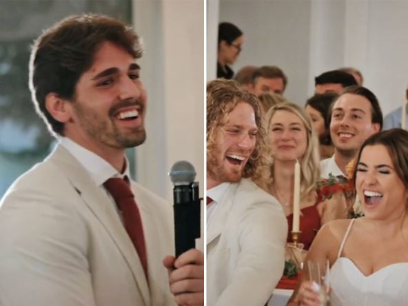 "Primetio sam tu posebnu povezanost koju su imali. Smejali su se svemu zajedno i gledali su se na poseban način. Verovatno ste odmah pomislili kako je to stvarno romantično, ali jedini problem je taj što sam ja u to vreme bio u vezi sa Rejčel. Ja sam prvi bio sa njom", rekao je kum, a na snimku se vidi reakcija mladenca koji se smeju i nazdravljaju.