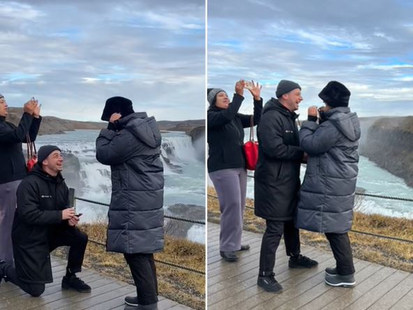 Ipak, romantični trenutak pokvarila je turistkinja koja je, u trenutku dok muškarac kleči, preskočila njegove noge pokušavajući da fotografiše vodopad. Na svu sreću, ova situacija je buduće mladence nasmejala i devojka je rekla "da". Turistkinja se nije pomerila, nastavila je da snima kao da se ništa ne događa.