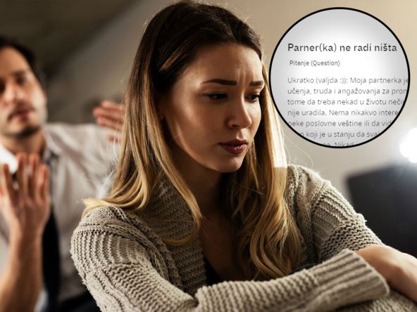 "Ukratko (valjda). Moja partnerka je stvarno dobra osoba, ali brate mili, što se tiče učenja, truda i angažovanja za pronalazak posla, kao da nema nikakvu razvijenu svest o tome da treba nekad u životu nečime da se bavi. Upisala faks, studirala 100 godina i ništa nije uradila. Nema nikakvo interesovanje da krene nešto da uči, da se potrudi da stekne neke poslovne veštine ili da vidi šta bi mogla i bez završenog fakulteta da radi. Pritom sam ja tip koji je u stanju da svakog dana i pored posla počisti stan, spremi ručak ili bilo šta da pomogne. Nikad joj nisam, niti ću zameriti ako dođem s posla, a ručak nije spreman, stan očiśćen i slično.