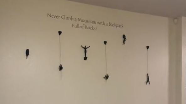 "Nikad se ne penjite na planinu sa rancem punim kamenja", pisalo je iznad.