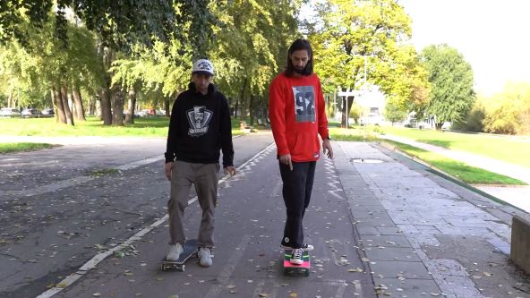 Okej, Stefan je naučio da stane na dasku: jedno stopalo ide napred, paralelno s ivicom daske, drugo pozadi, položeno - njime se odgurujemo. Onda se okreće prednje stopalo, stavlja u paralelu sa zadnjim i kreće vožnja. "Opusti se malo, u kolenima pogotovo, nemoj da glumiš", savetuje "učitelj".
