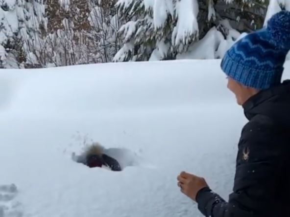 "Umotani" mališan se najpre smeje u maminom naručju, a onda u "slow motion" snimku upada u sneg tako da se više ni ne vidi!