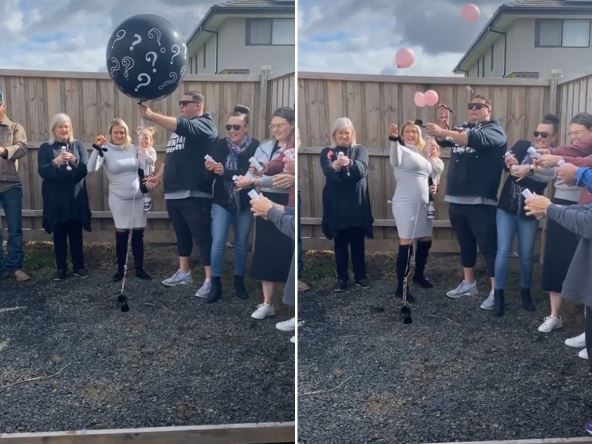 Na snimku se vidi kako on i njegova supruga, u krugu rodbine i prijatelja, buše balon koji donosi vesti kog pola je beba koju očekuju.