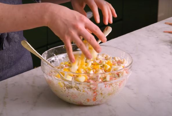 Obarite testeninu, jaja isecite na kockice, kao i omiljeni tvrdi sir i šunku. Kisele krastavčiće isecite na kolutiće. Pomešajte sve sastojke, i začinite prelivom od malo majoneza, jogurta i senfa. Začinite solju i biberom.