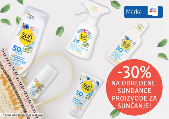 Ukoliko još niste upoznali ovaj dm brend, uz koji najčešće stoji epitet "nemački kvalitet po super ceni", vreme je da potražite svog SUNDANCE favorita i odlučite se, recimo, za one koji sprečavaju preuranjeno starenje kože i nastanak bora, ili pak one koji ne sadrže parafin ni sintetičke mirise i u potpunosti su sigurni za primenu. Svi proizvodi za sunčanje koje možete da pronađete u dm drogerijama dermatološki su ispitani i poseduju UVA i UVB zaštitu, što je takođe veoma važno kada birate kremu sa zaštitnim faktorom. Ovog meseca, dm je rešio da obraduje svoje kupce obezbedivši 30 odsto popusta na određene SUNDANCE proizvode koji važi do 30. juna.