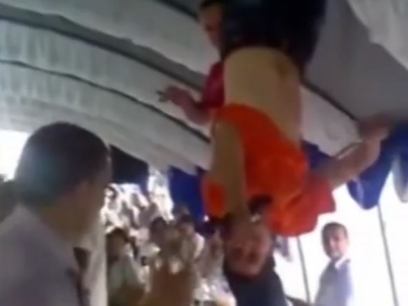 A ono što je posebno "uvrnuto" u ovom snimku, nije violinista koji svuira dok visi sa melane konstrukcije šatre, već gost koji ga dok tako visi gladi po stomaku...