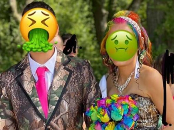 Fotografija srećnog para postala je hit na Redditu, ni manje ni više nego zbog venčanice i odela. Njih svoje su izgleda želeli da budu originalni, pa su odabrali "kamuflažni" print za venčanicu i odelo, dok je mladoženjina pink kravata uklopljena sa upadljivim mladinim buketom.
