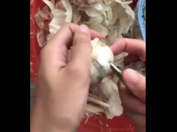 Štos je u tome da nožem ubodete svaki čen, a da ga ne vadite iz glavice, i brzim potezom povučete. Ljuska će ostati, a vi ćete dobiti očišćen komadić belog luka.