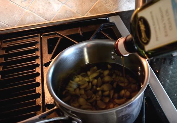 Prvo propržite beli luk na maslinovom ulju minut. Dodajte sve ostale sastojke i mešajte sve na blagoj vatri pet minuta. Skinite sa vatre i ostavite da se ohladi, a zatim sipajte u staklenu teglu, zatvorite je poklopcem i stavite je u frižider.