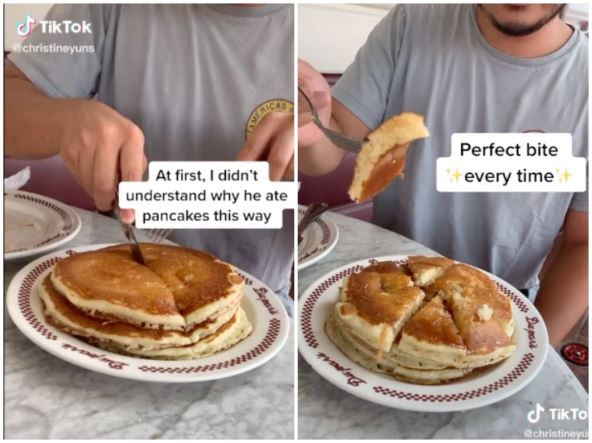 On je u videu objavljenom na TikToku, koji je već pogledalo više od tri miliona ljudi, pokazao da palačinke jede naređane jednu na drugu, tako što najpre iseče palačinke na četvrtine, pa zatim svaki deo još na pola.