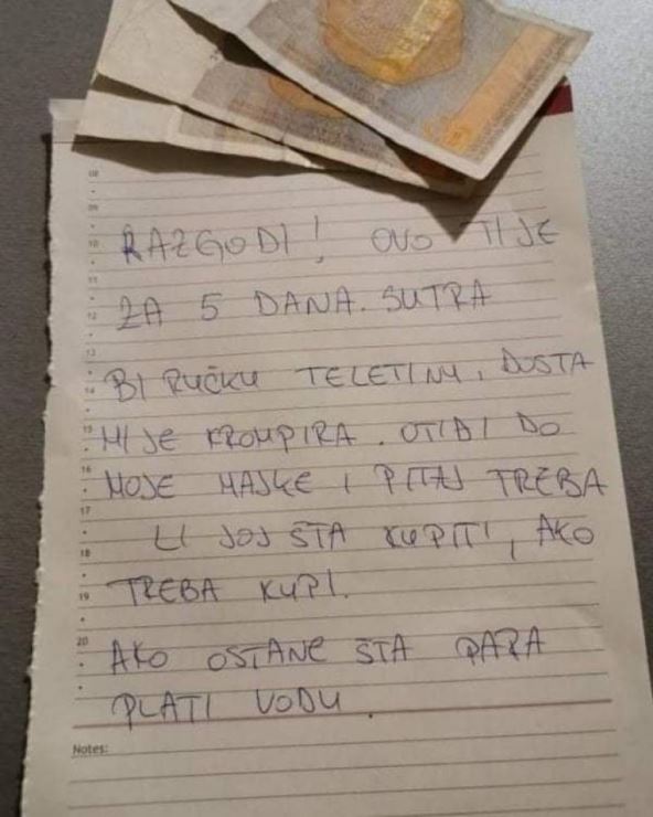 "Ovo ti je za 5 dana. Sutra bih ručao teletinu, dosta mi je krompira. Otiđi do moje majke i pitaj je treba li joj šta kupiti, ako treba - kupi. Ako ostane šta para, plati vodu."