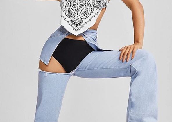 Farmerke pristupačnog brenda "Shein" u svetloplavoj nijansi imaju široke nogavice, ali veliko je pitanje šta ih drži "na okupu" jer gore nemaju ceo deo oko međunožja!