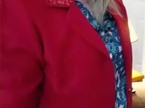 Njen muž je na Fejsbuku objavio kako je u second hand radnji dugo birala, i na kraju odabrala i kupila crveni komplet, sako i pantalone.