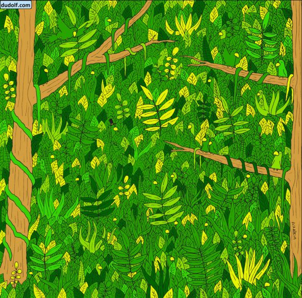 Jedna od najpopularnijih je ilustracija džungle. Iako to verovatno ne vidite na prvi pogled, među rastinjem, lišćem i dva drveta se zapravo nalazi i jedna životinja. Kako bi rešenje bilo što komplikovanije, "skrivena" životinja je zmija koja je zapravo iste boje kao lišće.