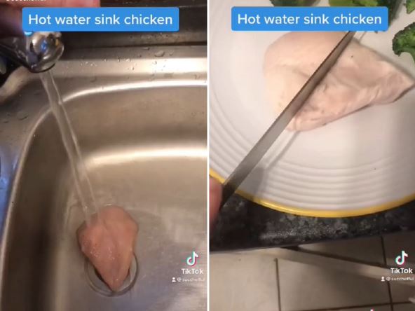 U videu u kojem se vidi kako ubacuje pileći file u sudoperu, a zatim pušta vruću vodu i tako čeka da se skuva. Iako komad mesa spolja izgleda skuvan, to nije ni približno dovoljno kuvano da bi bilo bezbedno pojesti ovako spremljenu piletinu.