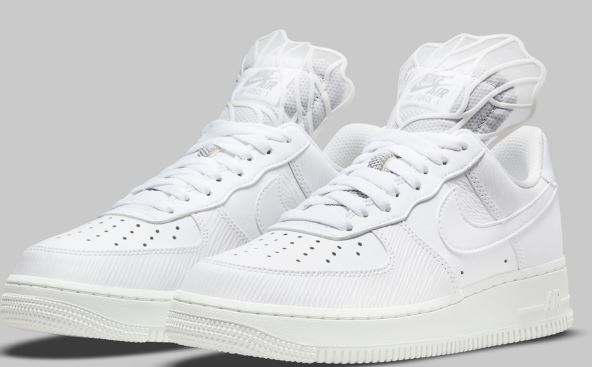 Beli Air Force 1 model, ukrašen sivim detaljima, na jeziku ima ukras nalik krilima dok je pozadi palmin list, i natpisa na kojem je trebalo da piše "Nike" grčkim alfabetom.