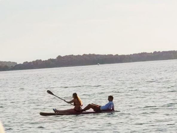 Na fotografiji se vidi par na dasci za veslanje, a ništa ne bi bilo čudno da žena ne vesla, dok se njen partner izležava "sve u 16" i odmara.