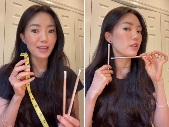 "Pomoću ovog trika saznajte da li će vam stajati kraća kosa. Sve je u zamiljenom uglu koji obrazuju brada i ušna resica. Potrebne su vam samo dve olovke i metar za merenje", kaže ova brineta.